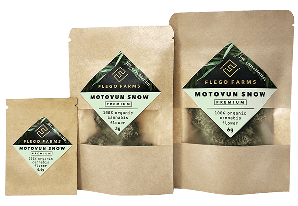 by Flego Farms is a premium, 100% organic cannabis flower known for its frosty coating and earthy smell & aroma. Housed in natural craft packaging with a clear window, each batch reflects the garden sustainable practices and commitment to purity. With its dense structure, hand-trim, and quality, Motovun Snow captures the care behind Flego Farms selection.